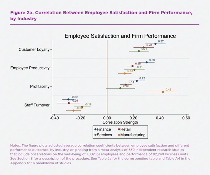 Najnowszych dowodów w tym zakresie z 2019 roku możemy szukać w raporcie “Employee Well-being, Productivity and Firm Performance”, stworzonym przez naukowców z London School of Economics, MIT Institute i Oxford University. Analizując sytuację w różnych branżach, naukowcy doszli do jednego wniosku – dochodowość firmy i produktywność zespołu w każdym przypadku jest powiązana z dobrostanem i satysfakcją pracowników, szczególnie w branży produkcyjnej. Zadowoleni pracownicy to bardziej lojalni klienci i mniejsza rotacja w zespole.